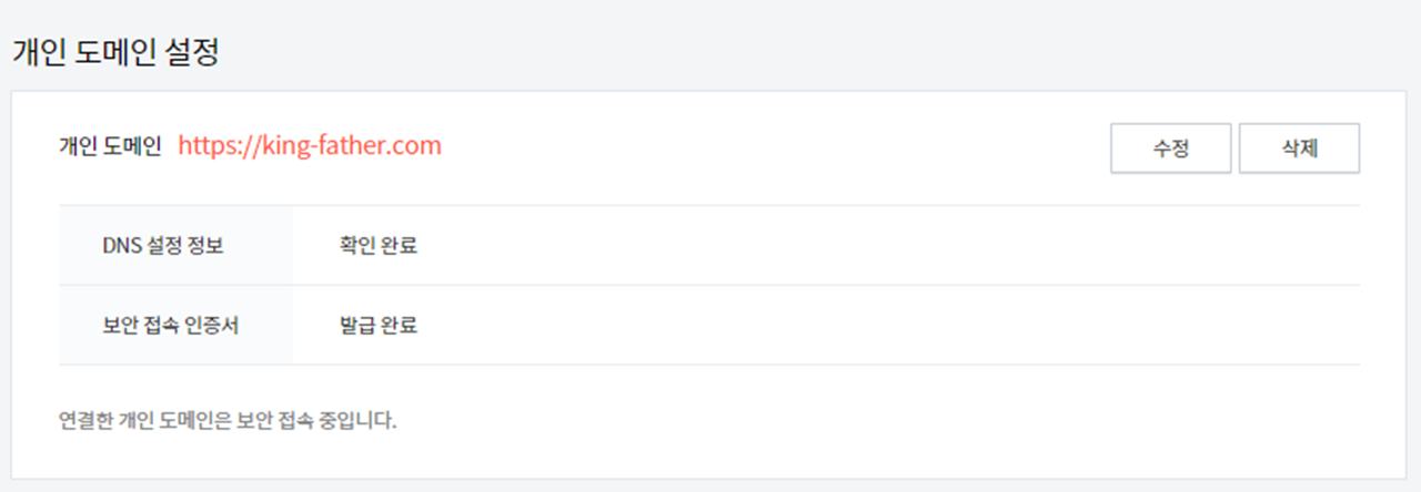 개인 도메인 주소를 입력하면 DNS 설정 정보와 보안 접속 인증서 완료가 뜬다. 보안 접속 인증서는 '발급 완료'까지 시간이 조금 걸릴 수도 있으니 기다려보자. 이렇게 하면 끝이다.