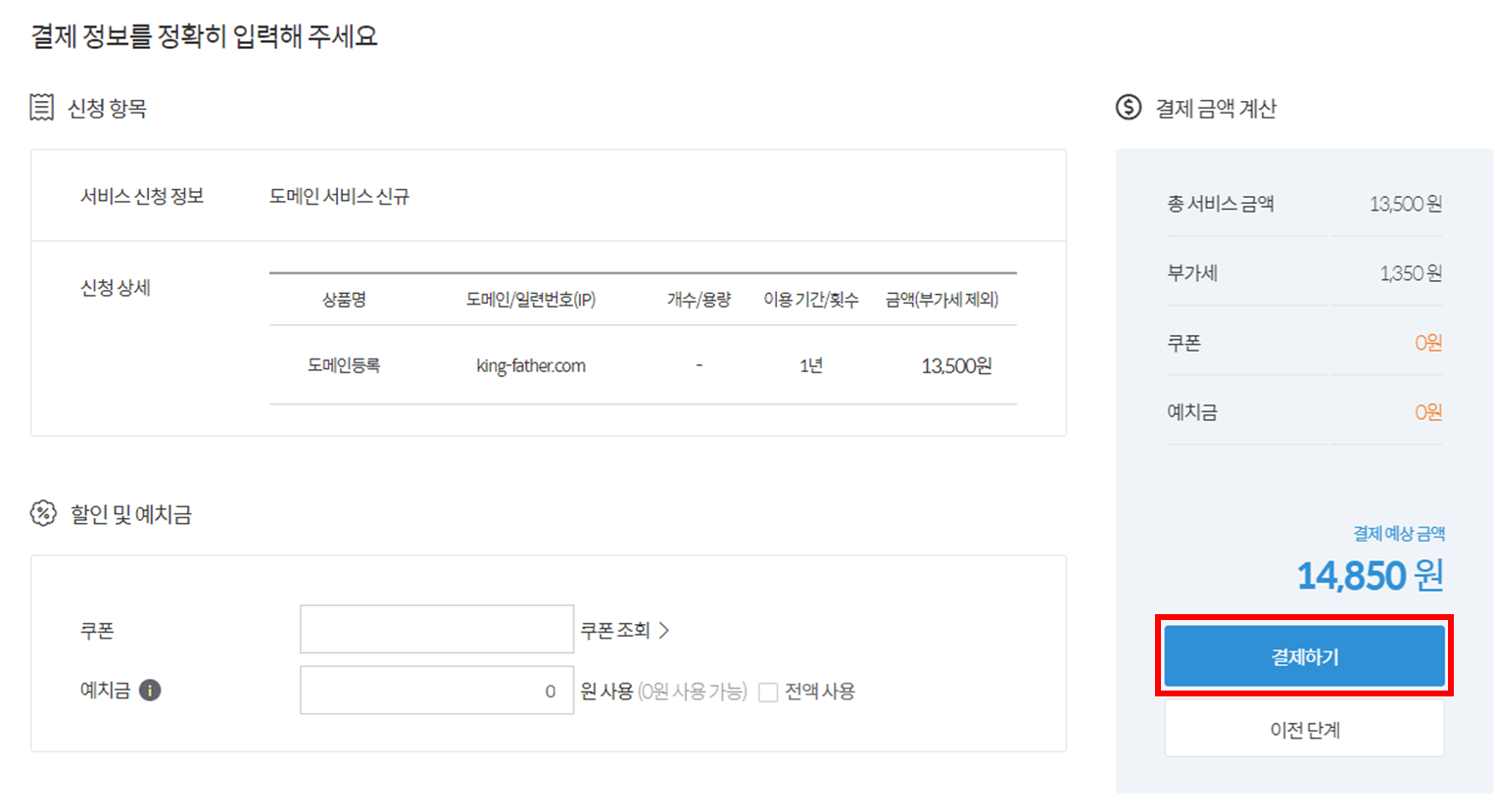 2차 도메인 주소를 한번 더 확인하고 이상없으면 이용 기간과 금액을 확인하고 결제한다.