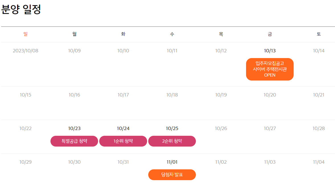 분양일정은 10.23 특공, 10.24 1순위, 10.25 2순위이다.