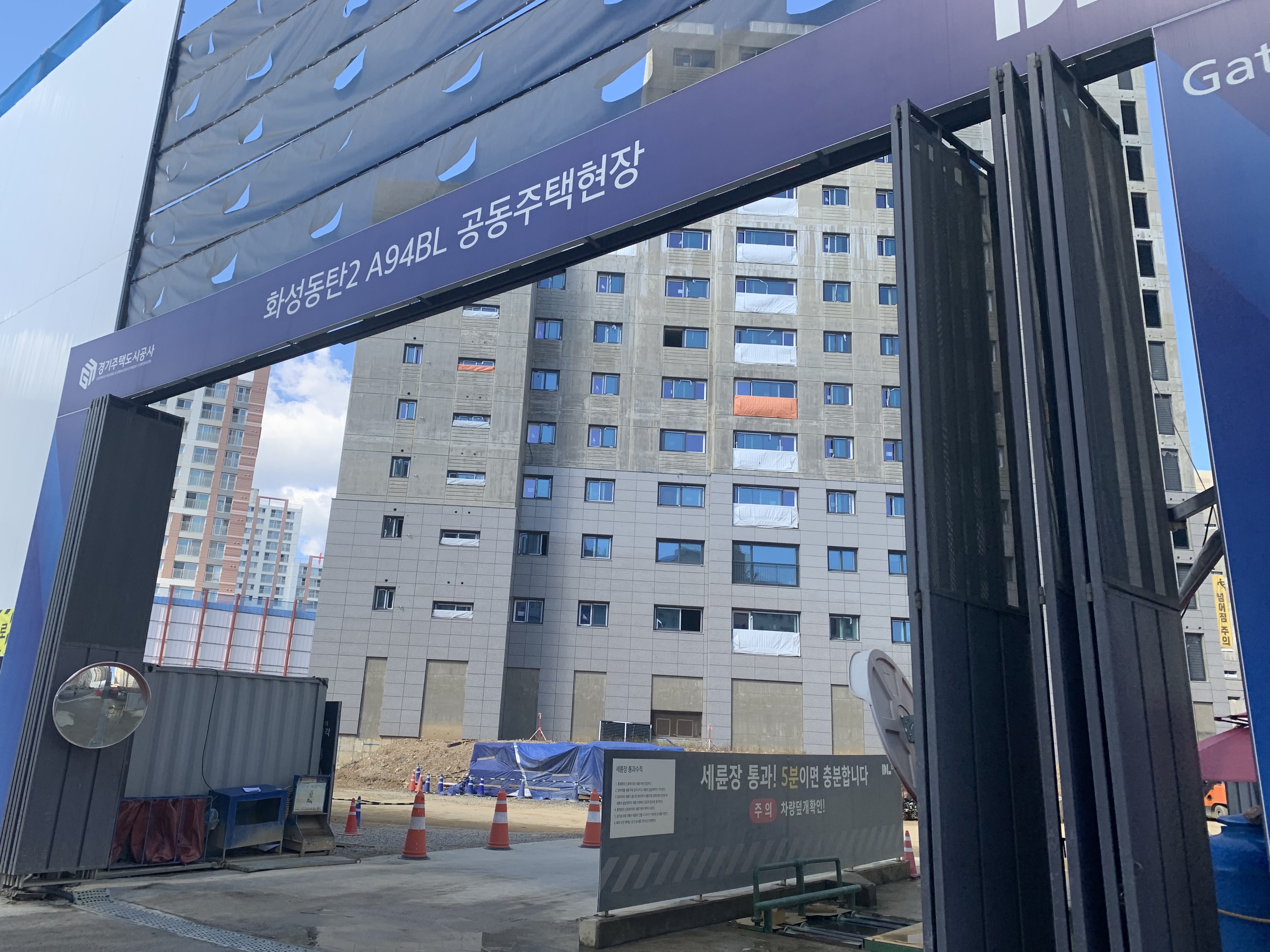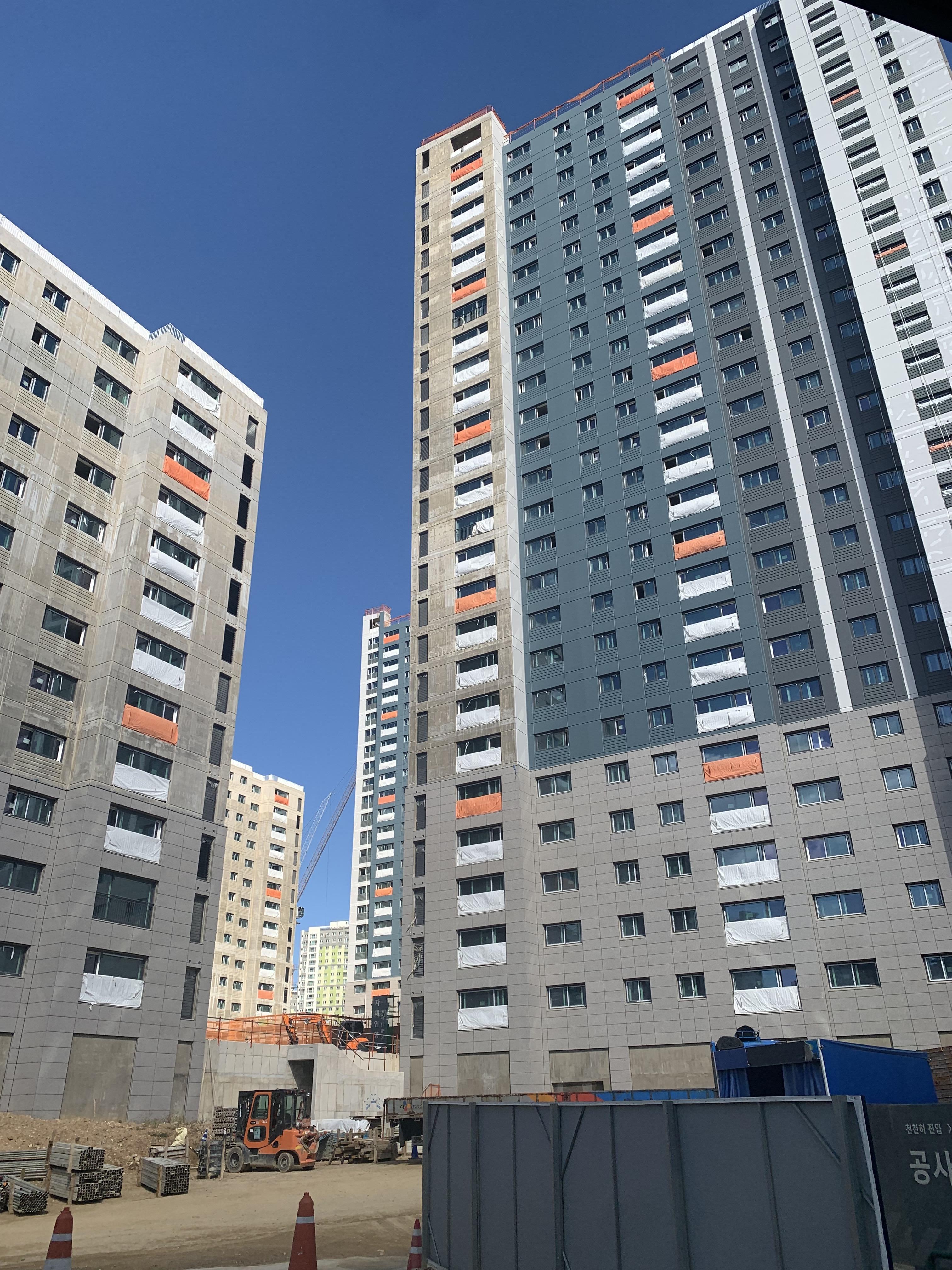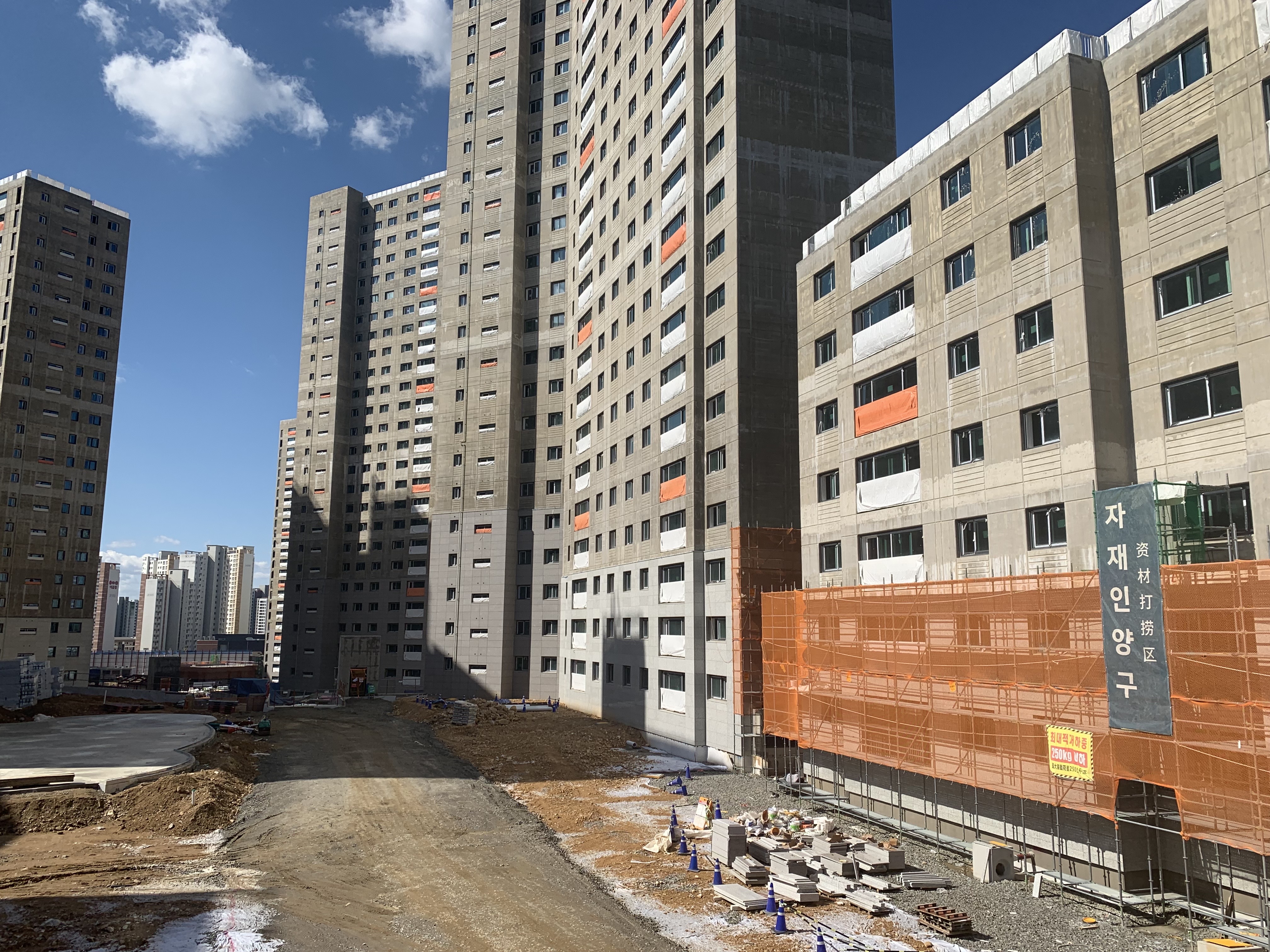 단지 남쪽으로 바로 앞에 상가가 있어서 그곳에 주차했다. 현장을 방음벽으로 둘러싸고 있어서 저층부는 보이질 않는다. 우선 골조는 끝났고 이제 마감작업이 한창 진행 중인가 보다.