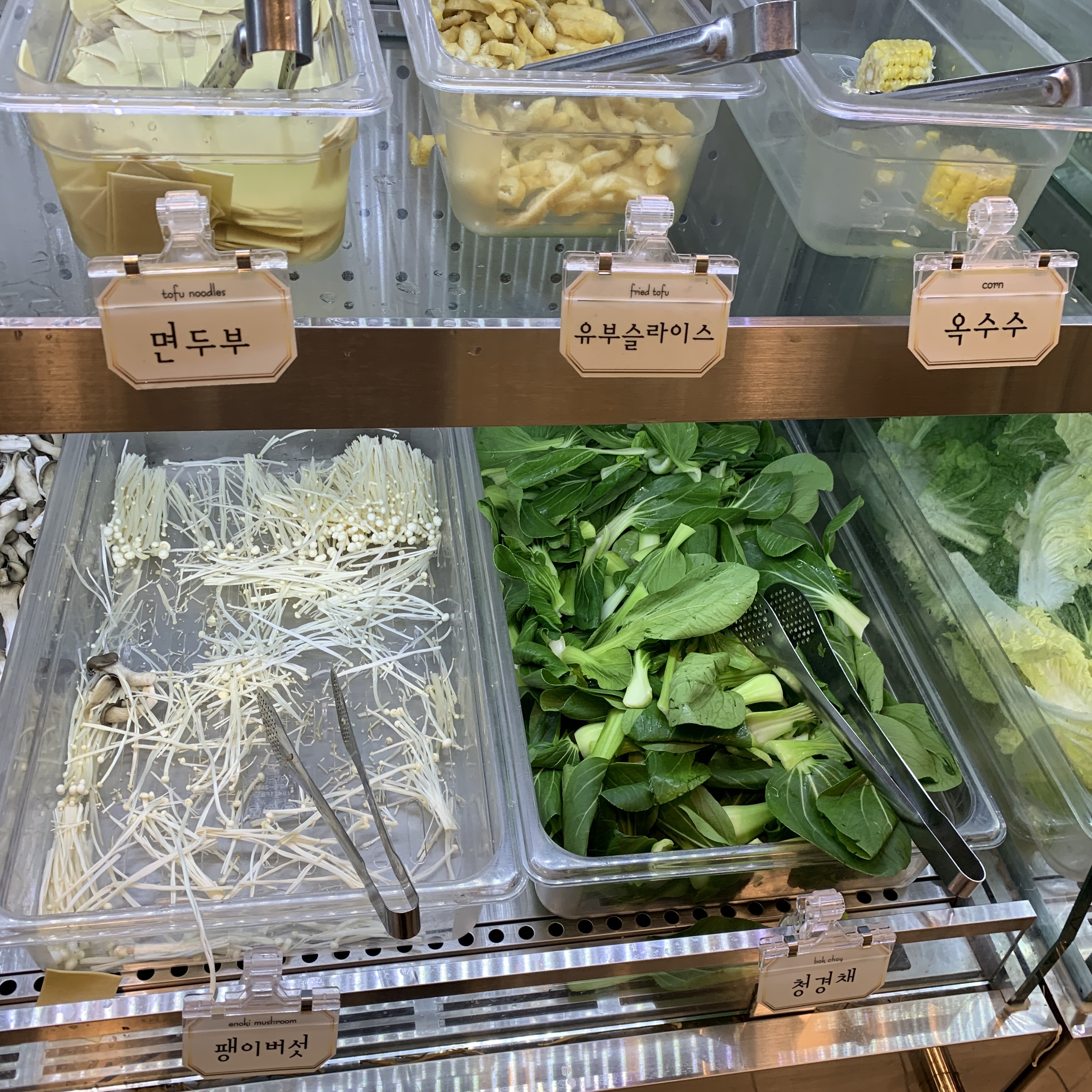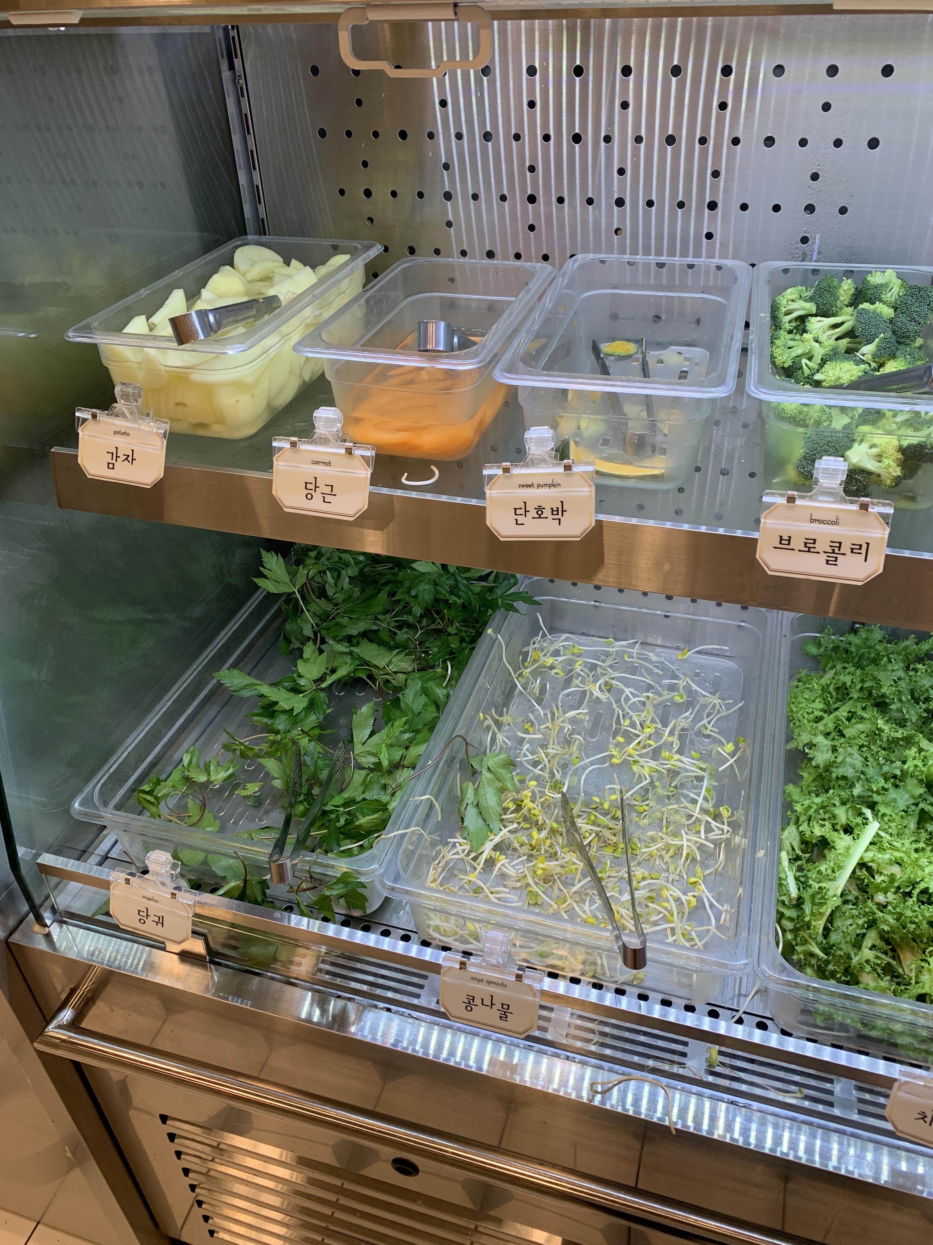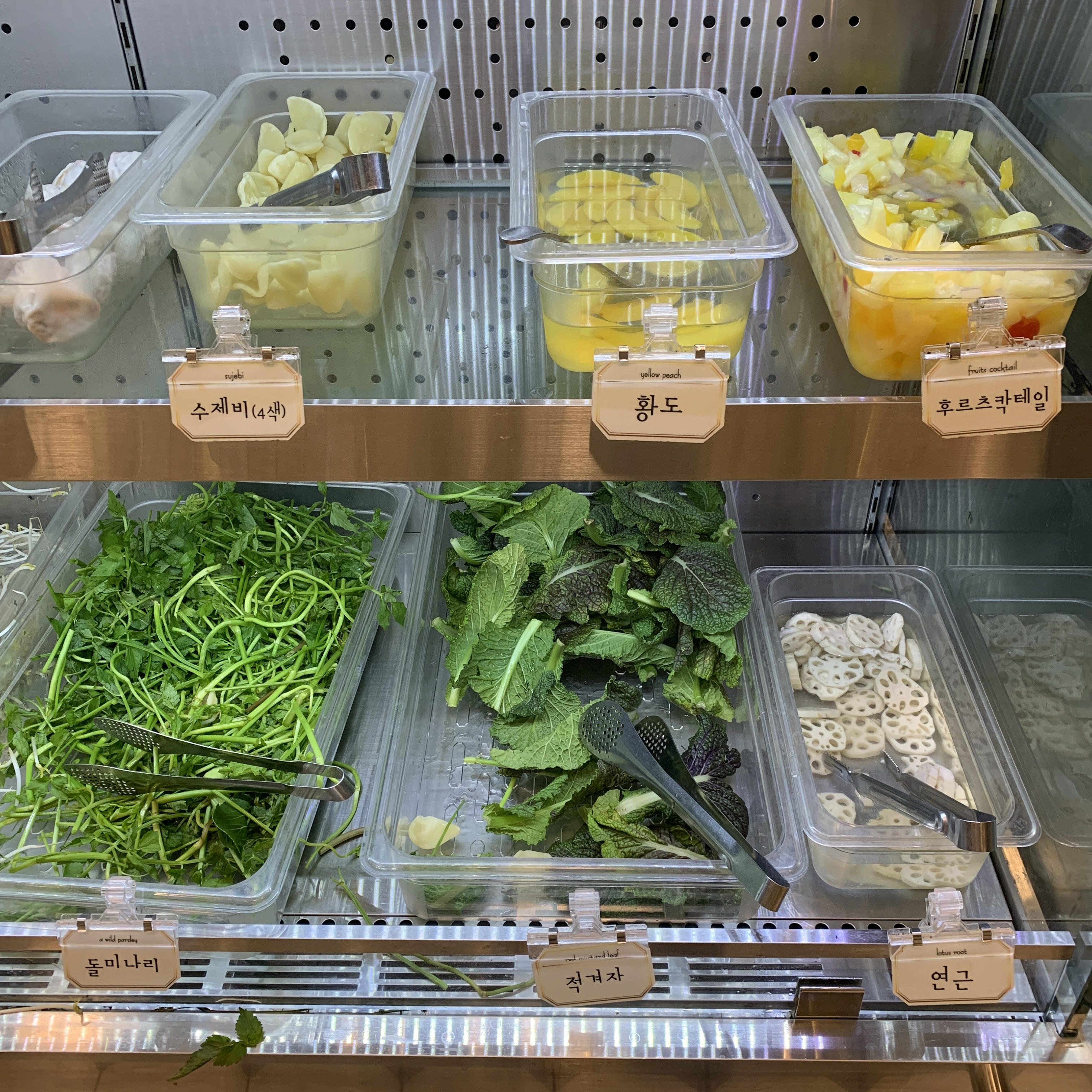 야채류 : 얼간이, 케일, 아욱, 당귀, 콩나물, 치커리, 쌈추, 적근대, 근대, 고수, 취나물, 돌미나리, 적겨자, 숙주, 미나리, 청경채, 참나물, 쑥갓, 배추, 비타민, 양파슬라이스, 감자, 당근, 단호박, 브로콜리, 쥬키니, 푸주, 밤고구마, 청피망, 가지, 연근, 미나리