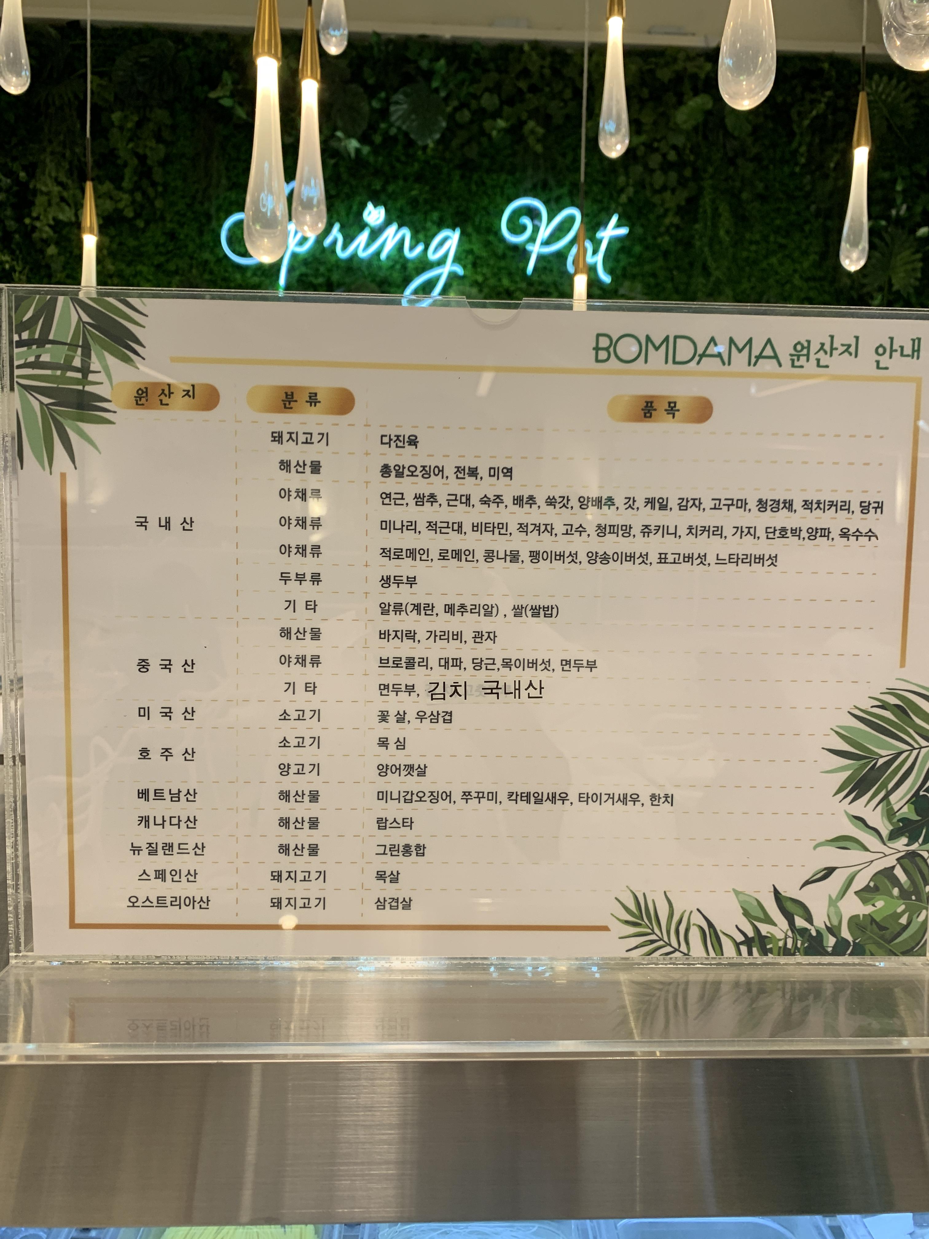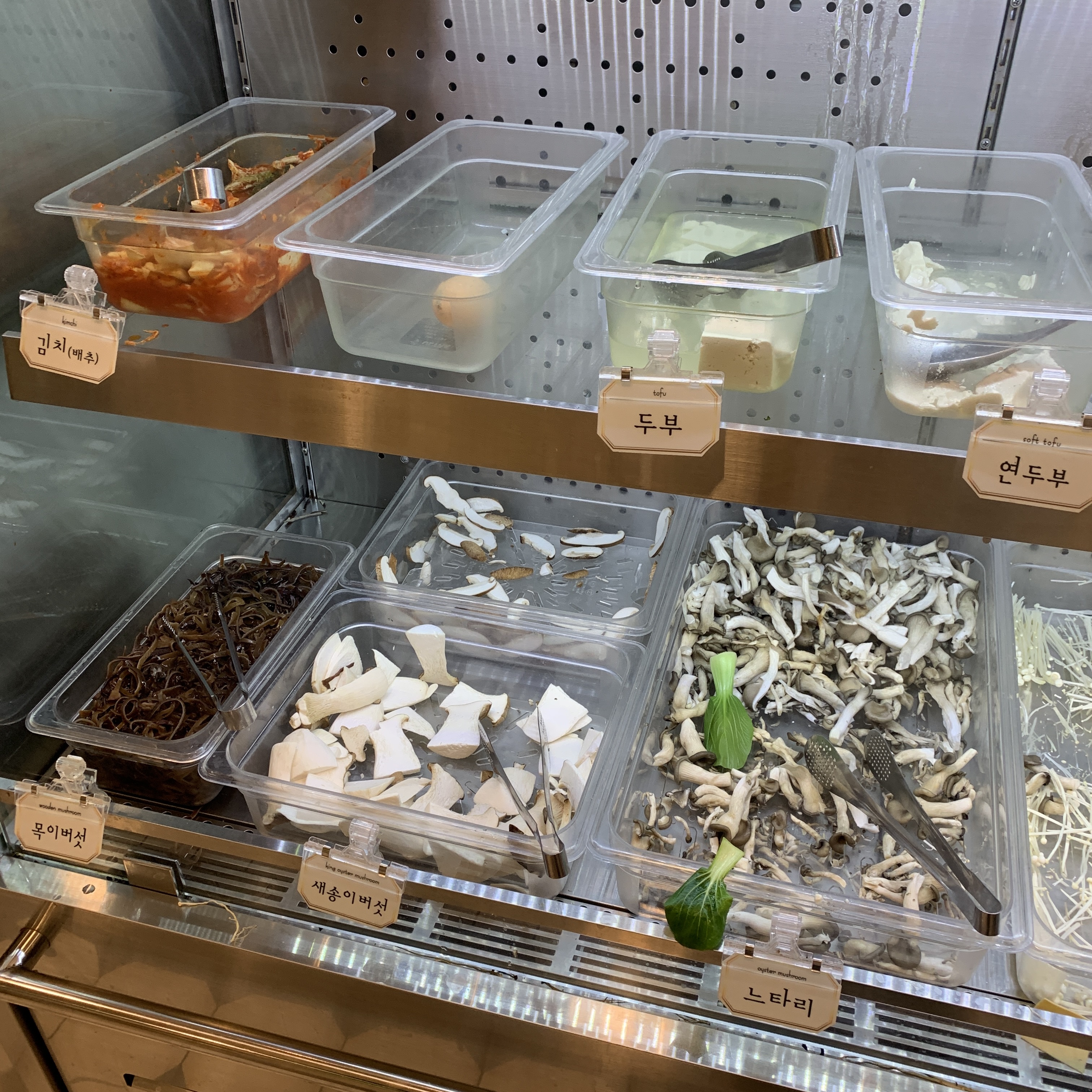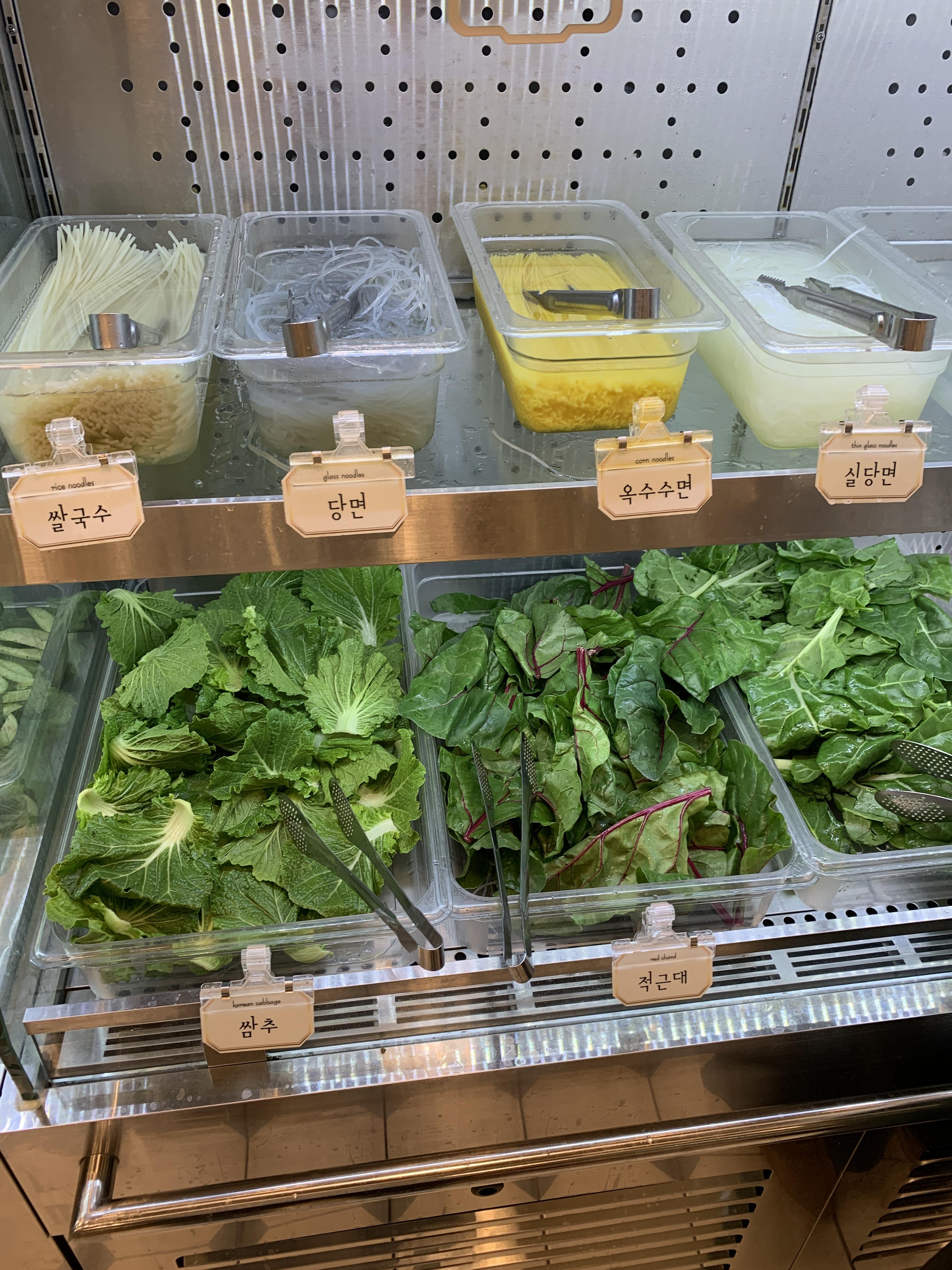 야채류 : 얼간이, 케일, 아욱, 당귀, 콩나물, 치커리, 쌈추, 적근대, 근대, 고수, 취나물, 돌미나리, 적겨자, 숙주, 미나리, 청경채, 참나물, 쑥갓, 배추, 비타민, 양파슬라이스, 감자, 당근, 단호박, 브로콜리, 쥬키니, 푸주, 밤고구마, 청피망, 가지, 연근, 미나리