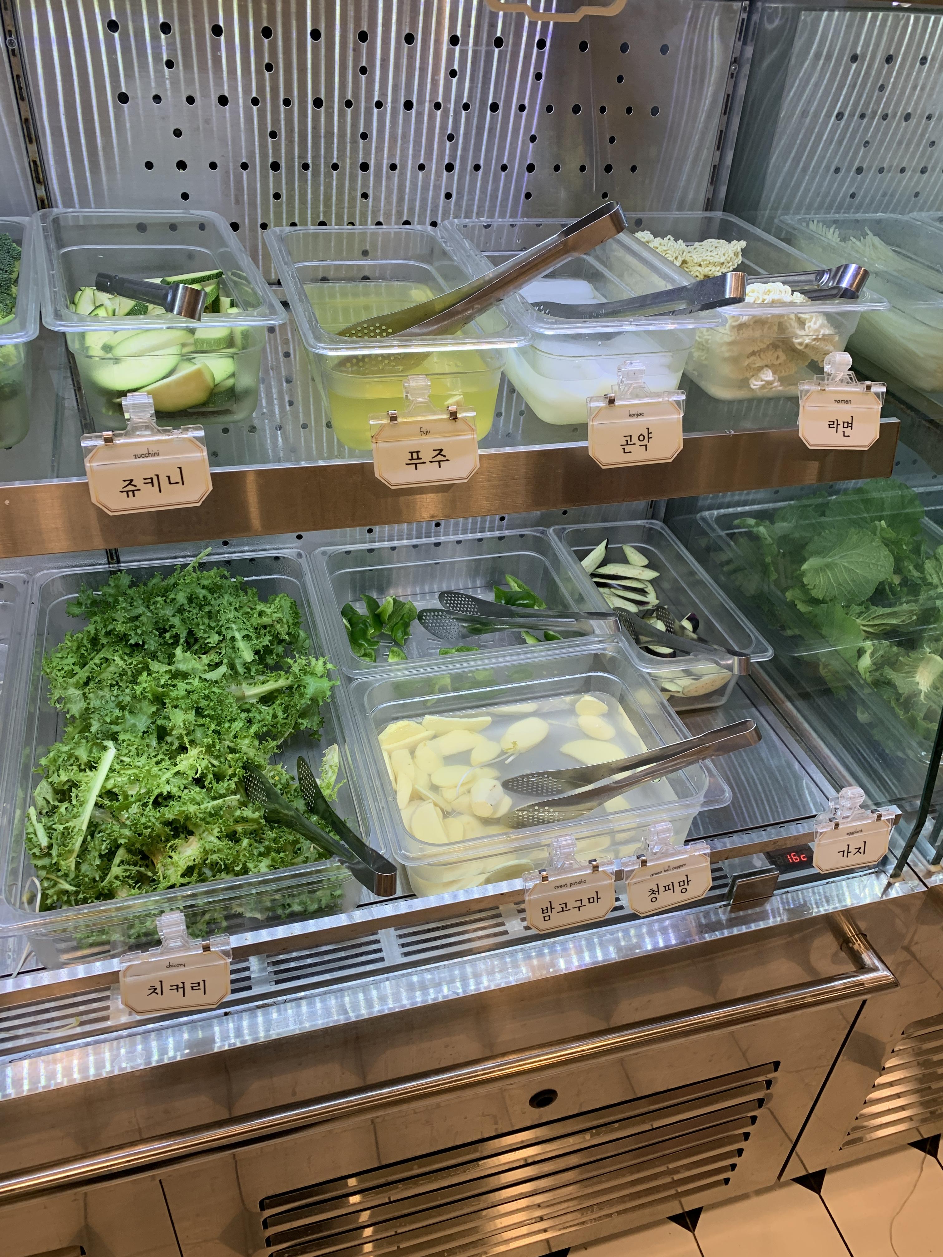 야채류 : 얼간이, 케일, 아욱, 당귀, 콩나물, 치커리, 쌈추, 적근대, 근대, 고수, 취나물, 돌미나리, 적겨자, 숙주, 미나리, 청경채, 참나물, 쑥갓, 배추, 비타민, 양파슬라이스, 감자, 당근, 단호박, 브로콜리, 쥬키니, 푸주, 밤고구마, 청피망, 가지, 연근, 미나리