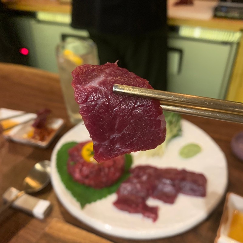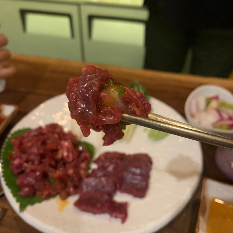 도착했으니 '뭉티기 + 육회‘로 바로 스타트 !