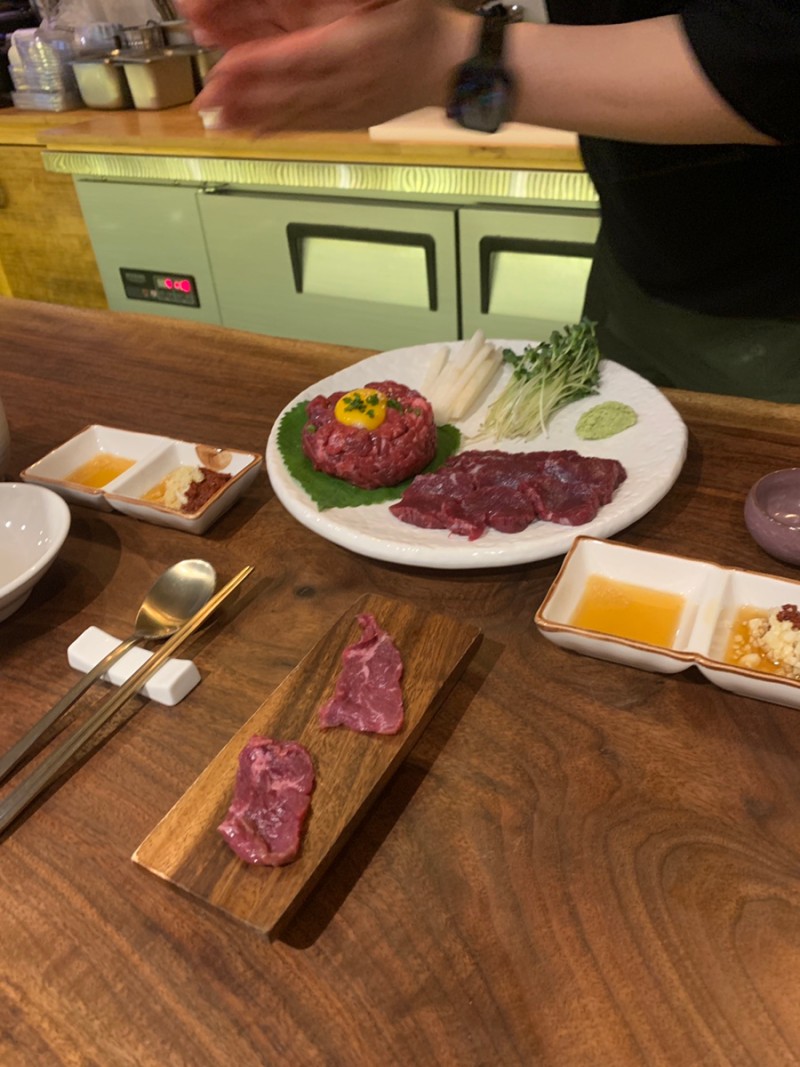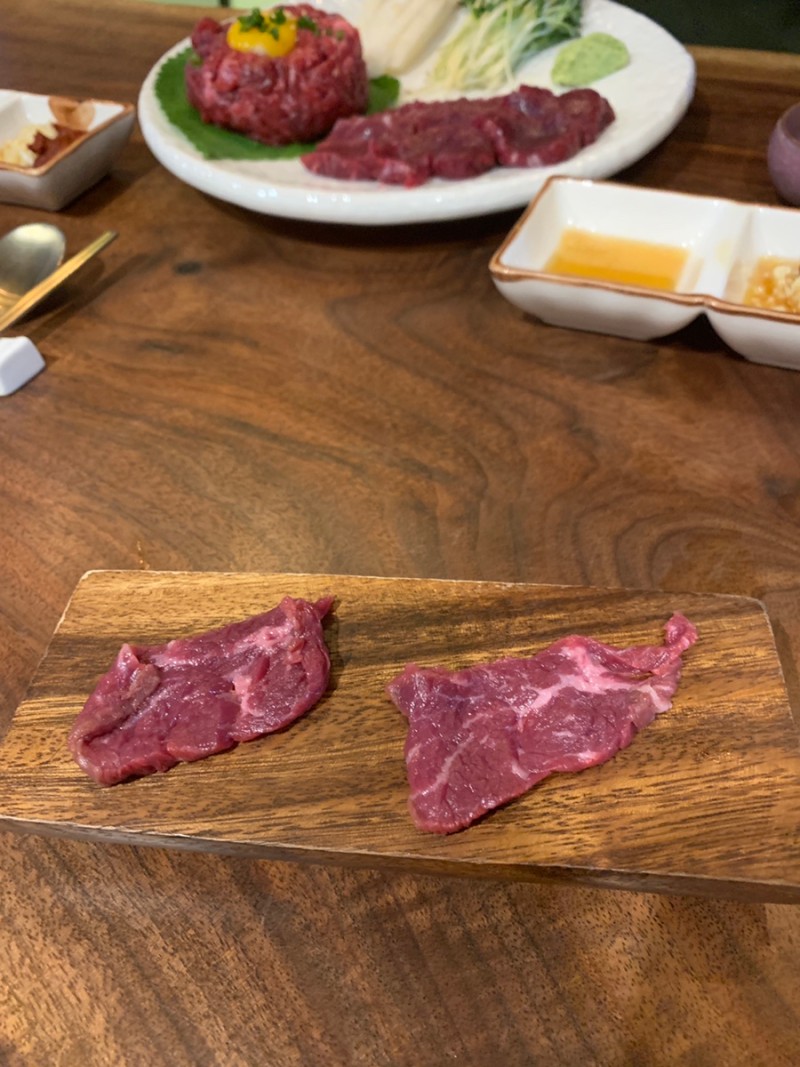도착했으니 '뭉티기 + 육회‘로 바로 스타트 !