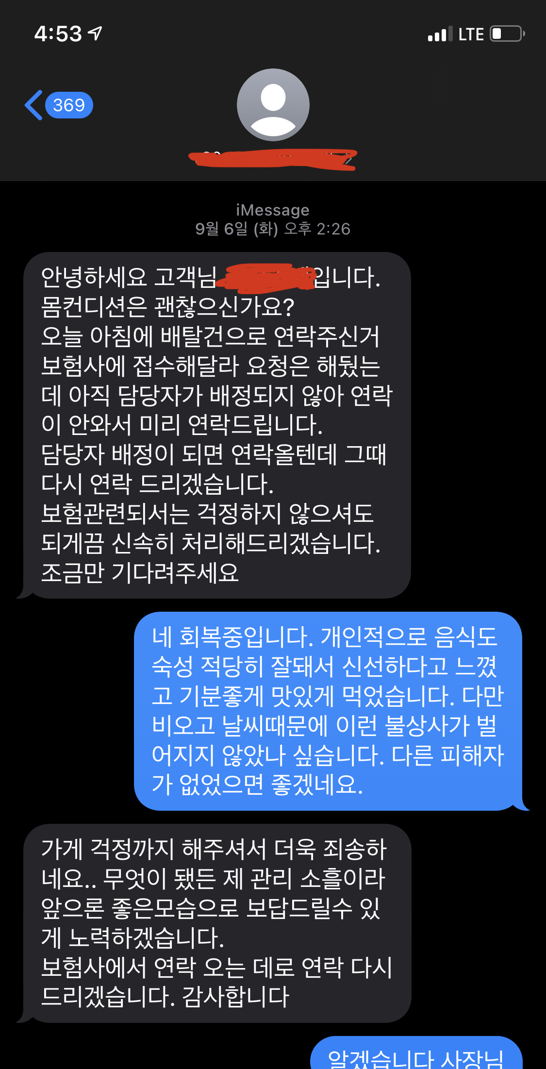 음식점에서 접수해준다고 연락하고 2시간정도 지난 후 보험사에서 연락이왔다
