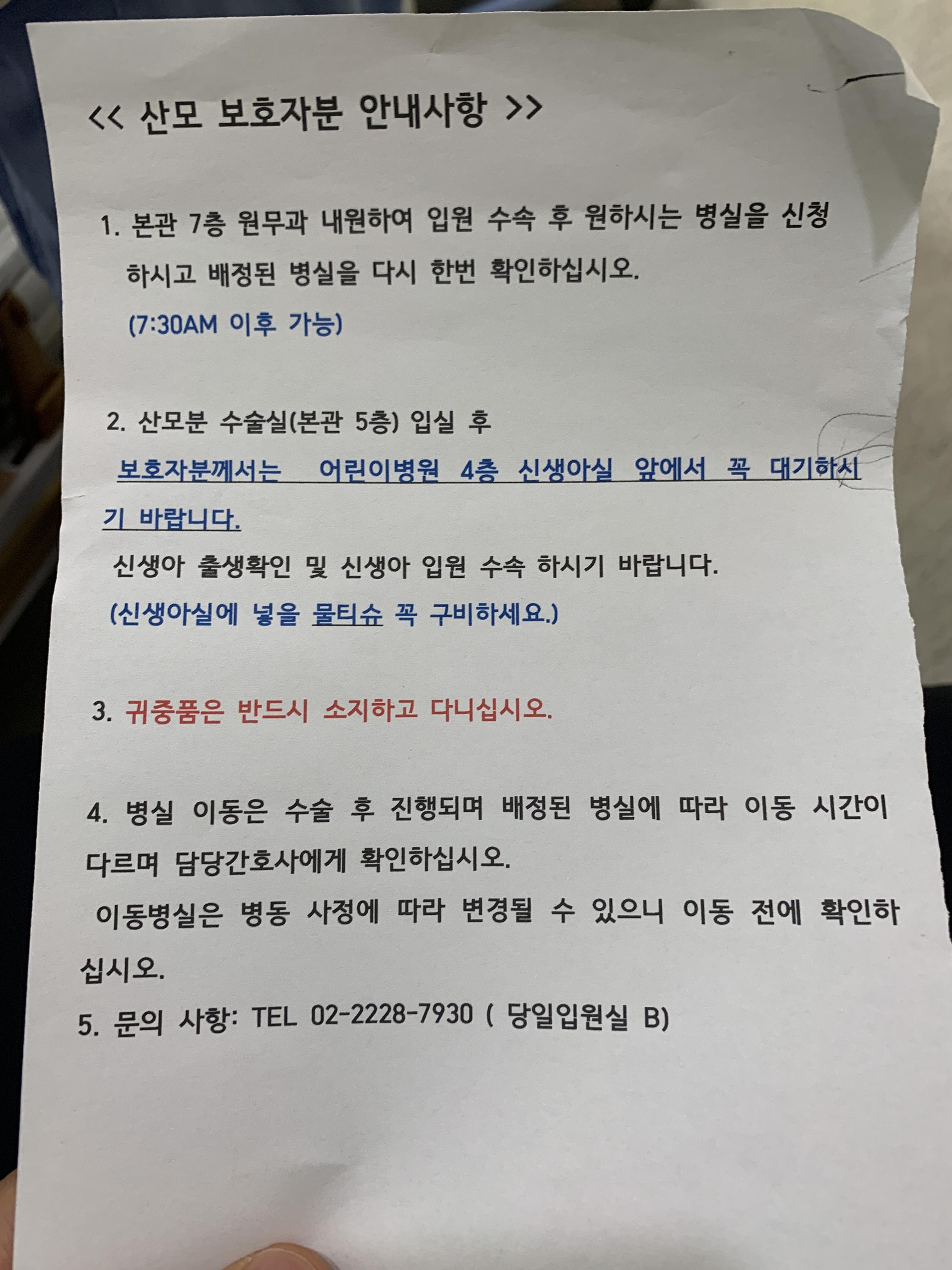 - 산모 병동 이동 문자 확인 후 산모 병실 입원 수속