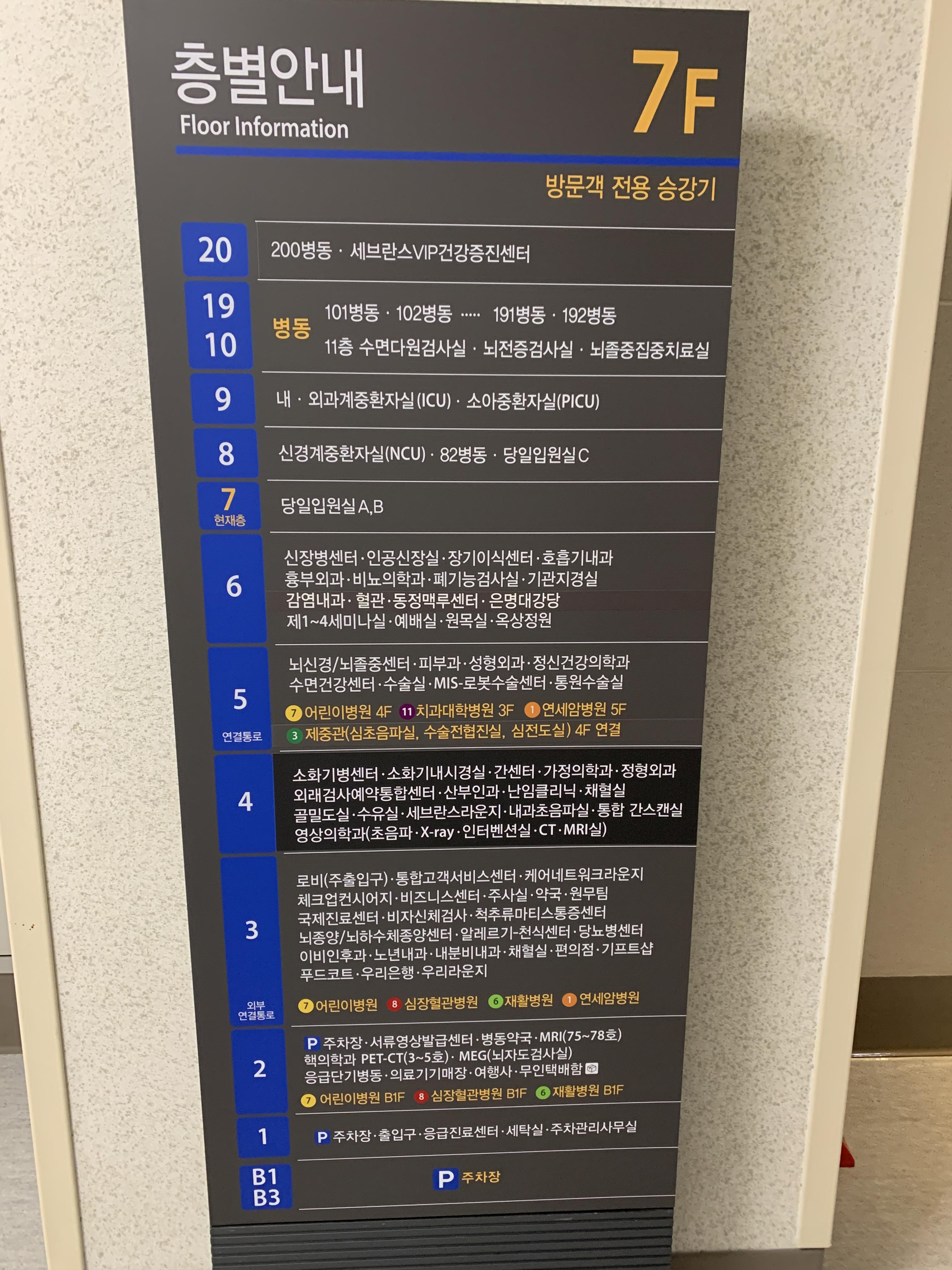 수술 전 잠시 머물 본관에 있는 당일 입원실(7F)로 향한다. 병동 엘리베이터는 사진 따라가면 된다.