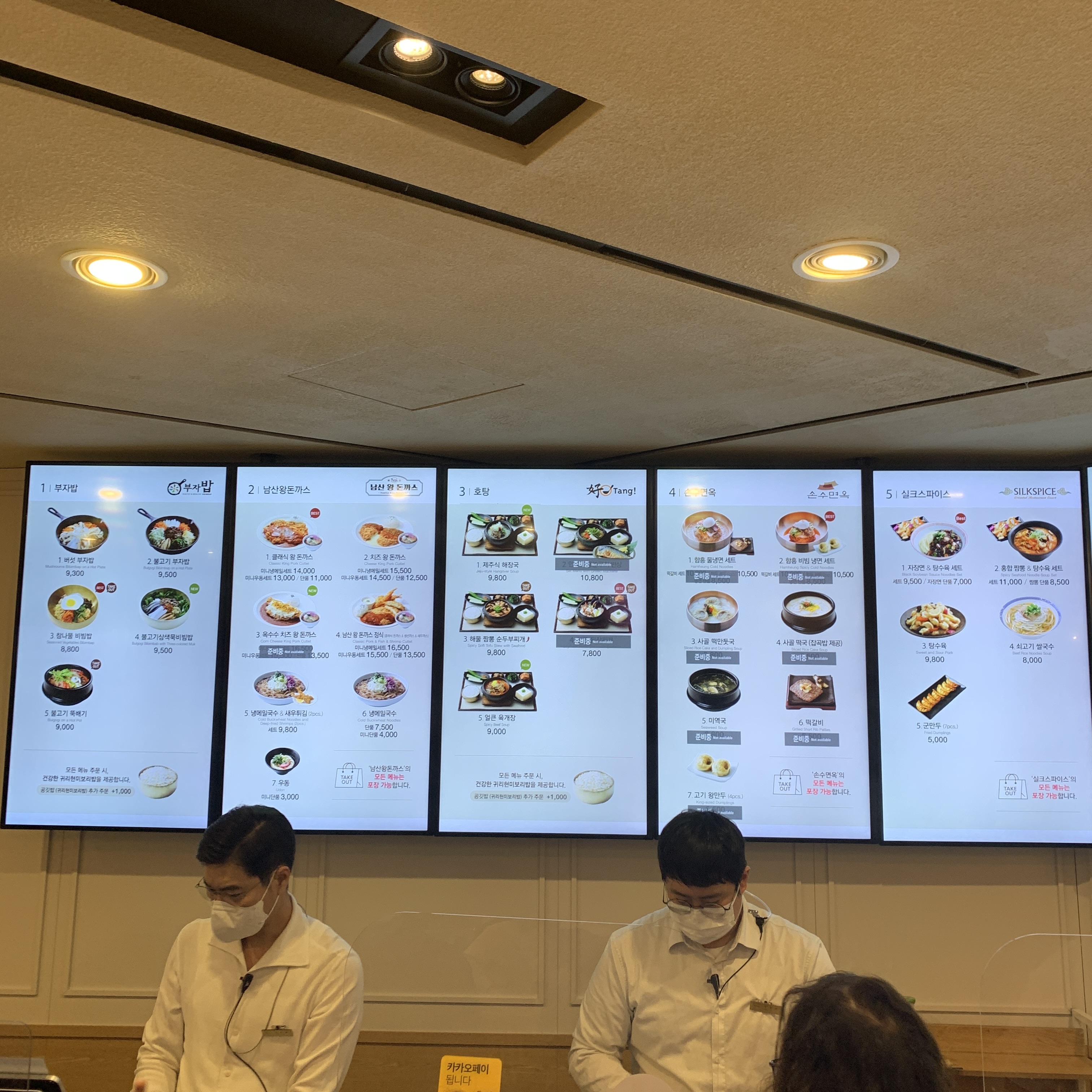 메인 식당이다. 부자 밥, 남산 왕돈가스, 호탕, 손수 면옥, 실크 스페이스가 자리 잡고 있다. 이곳은 사람이 정말 많기에 우선 자리부터 잡고 주문하는 걸 선호하고 음식 주문하는 방법은 총 3가지이다. QR코드로 주문을 처음 해봤는데 굉장히 시간이 단축되고 편하다.