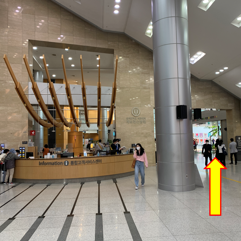 본관 3층에서 우측으로 가면 엘스 컬 레이터가 있다. 에스컬레이터를 따라 외부로 나가자마자 우측으로 가면 장례식장 1층 정문이 보이고, 그곳으로 들어가서 우측으로 가면 스타벅스가 보인다.