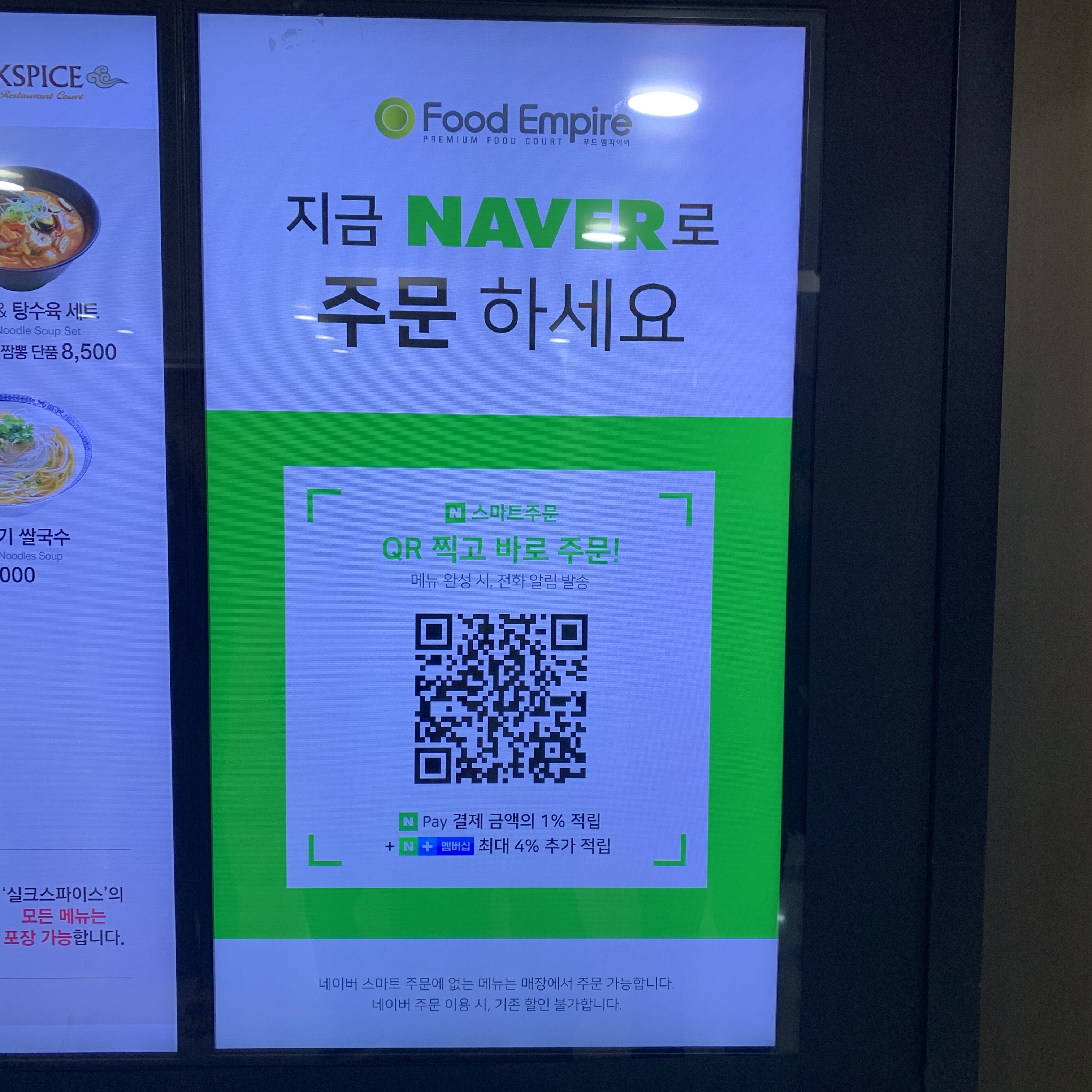대면 결제, 무인 주문기, 네이버 QR코드 총 3가지 방법으로 원하는 음식을 결제할 수 있다.