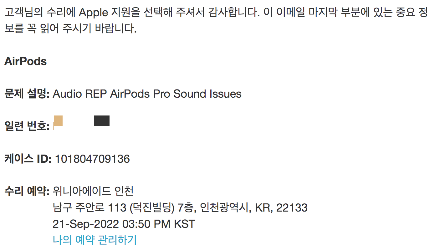 애플 정품 서비스센터에서 오프라인 매장 A/S 접수를 진행해주면 예약확인 메일이 온다.