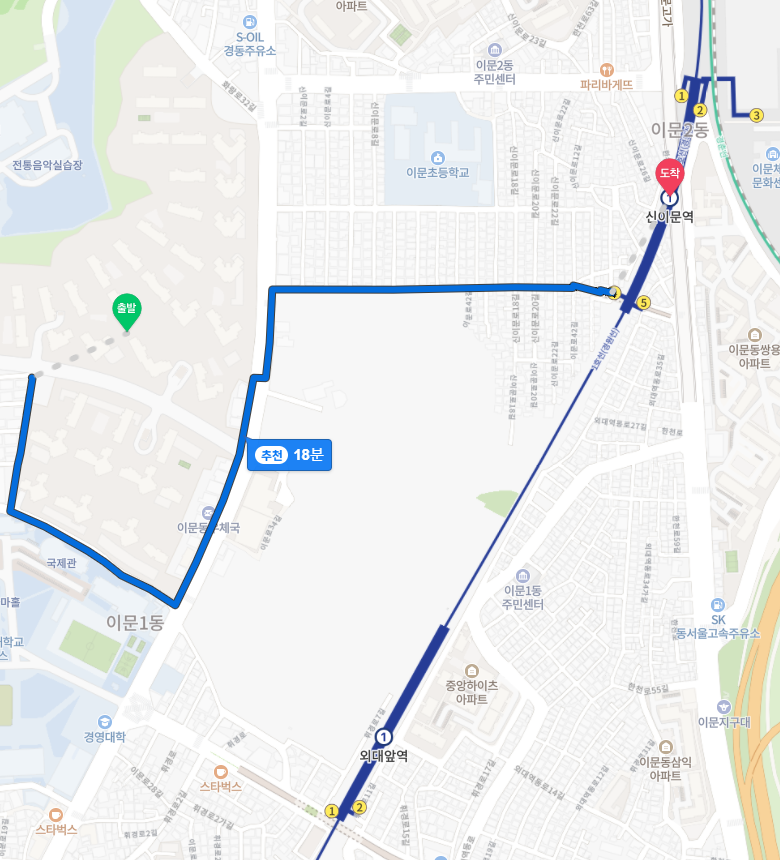 이문1구역 래미안 라그란데에서 지하철역까지 도보로 걸어간다면 외대앞역 10분, 회기역 20분, 신이문역 18분 거리다. 정문의 위치 여부에 따라서 시간이 조금 절약될 수도 있다.