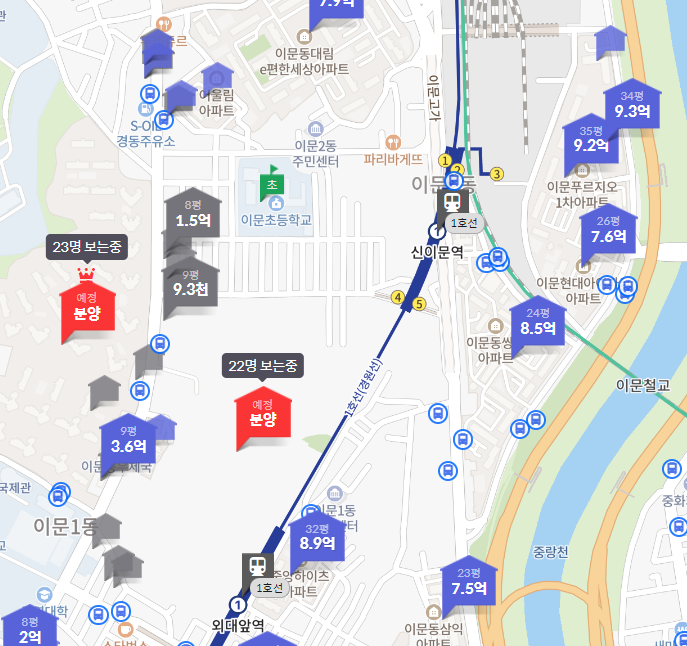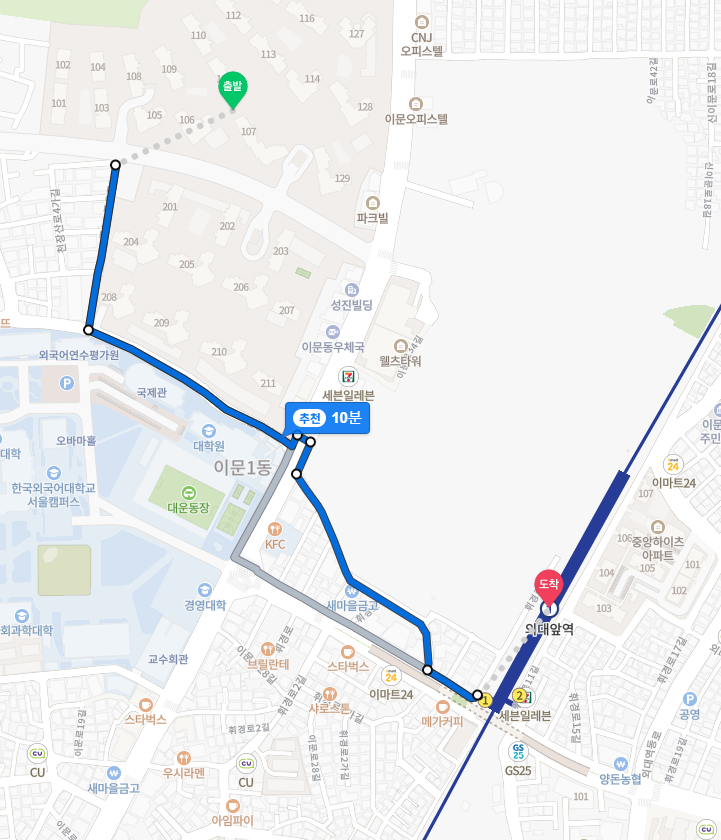 이문1구역 래미안 라그란데에서 지하철역까지 도보로 걸어간다면 외대앞역 10분, 회기역 20분, 신이문역 18분 거리다. 정문의 위치 여부에 따라서 시간이 조금 절약될 수도 있다.