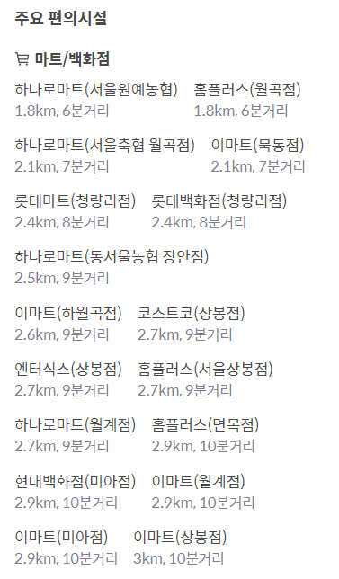 주요 편의시설로는 하나로마트, 홈플러스, 이마트, 엔터식스, 코스트코 그리고 현대백화점 미아점이 차로 10분 내로 위치해있다. 대형병원은 경희대병원, 삼육서울병원, 서울성심병원이 차로 5분 내외로 위치해있고 500m안팎으로 독구말공원, 청량공원이 있다. 그 외 반경 1km 이내 식품, 생활, 건강 업종별 시설이 잘 구비되어있어 실생활에 필요한 인프라는 부족함 없이 갖춰져 있다.