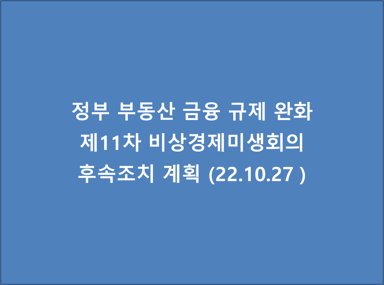 - 22년 10월 27일 정부는 거래 위축과 과도한 규제 등으로 어려움을 겪고 있는 상황을 해소하기 위해 부동산 금융 규제 완화를 속도감 있게 추진할 계획을 발표했다.