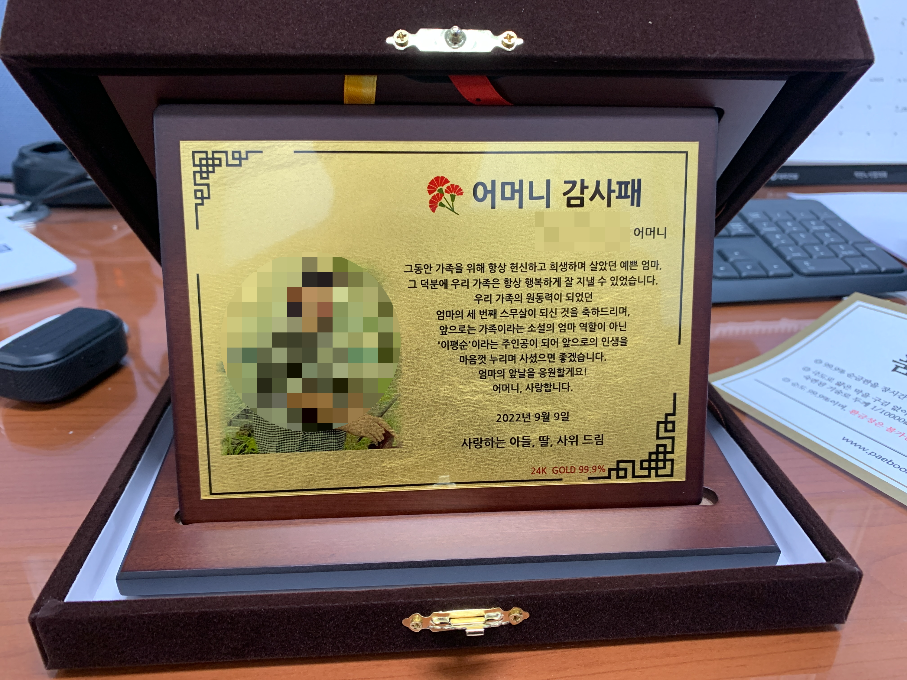 감사패는 시간이 지나도 집에 전시해놓고 언제든지 볼 수 있다. 부모님, 장인어른 때도 다 해드렸는데 반응이 좋고 오랫동안 간직할 수 있다.