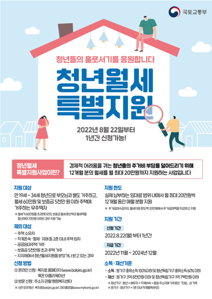 - 실제 납부하는 월세의 최대 20만 원까지 지원(임차보증금, 관리비 등 제외)