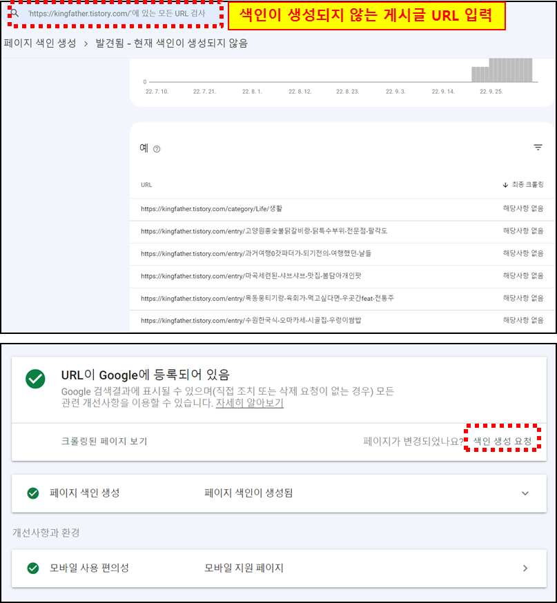 나의 경우는 모든 게시물들이 다음에서 노출이 되지 않아 게시글 하나하나 URL을 색인 생성 요청 신청했다. 사진은 내가 나중에 전부 정상으로 돌아오고 나서 캡처한 거다. 그때 당시에는 URL이 등록되지 않음, 페이지 색인이 생성되지 않음, 모바일 사용 편의성까지 모두 초록색으로 체크가 안돼 있었다. 게시글 하나하나 색인 생성 요청을 하니 하루도 안돼서 모두 정상으로 돌아왔고, 다음에 티스토리 블로그 게시글이 노출됐다.