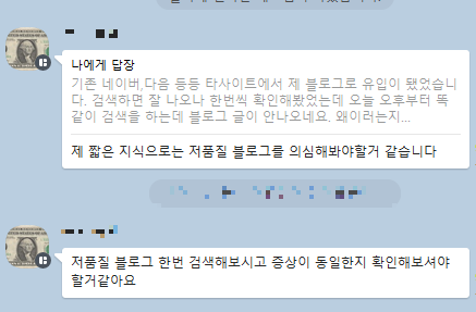 단톡방에 티스토리 잘하시는 분들이 많아서 내 상황을 알렸고, 한분이 저품질 블로그라고 의심해봐야 한다고 하셨다. 처음 들어보는 저품질 블로그.. 뭔진 몰라도 해결을 해야 하니 방법을 찾아보았다. 하루 만에 해결했고, 해결 방법 3가지를 포스팅해보겠다.