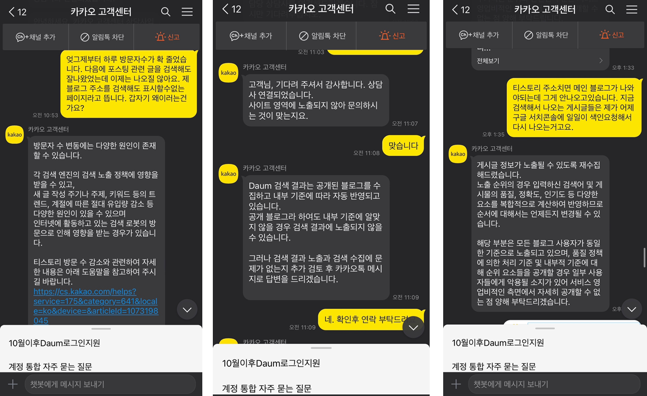있는 상황을 그대로 설명했고, 방문자 숫자가 내려가고 다음에 주소 검색이 안되는 걸 캡처해서 보내주니 상세하게 답변해줬다. 고객센터 상담원은 친절하게 답변해줬다. 답변은 블로그 검색은 매우 복잡한 과정을 통해 노출되고 있고 최근 상업적 블로그들이 많아짐에 따라 규제가 강화되고 있다고 한다. 다음 검색 결과는 품질관리를 위해 모든 포스팅과 사이트를 검색어에 노출시키지 않고 입력하는 키워드와 게시글의 품질, 정확도, 인기도 등 다양한 요소들을 복합적으로 계산해서 반영한다는 내용이다.