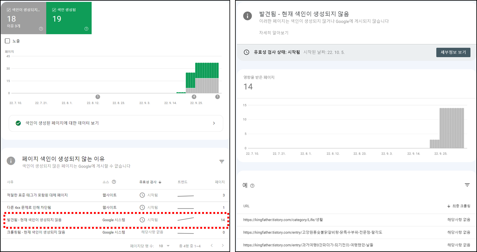 서치콘솔에 들어가 '페이지'로 들어가면 다음과 같은 화면이 나온다. 색인이 생성되고 생성되지 않은 항목수가 나오고, 생성되지 않은 항목에 대해서는 이유가 나온다. '현재 색인이 생성되지 않음'을 눌러보면 전체적으로 내가 올린 포스팅들이 크롤링 되지 않고 있었다.
