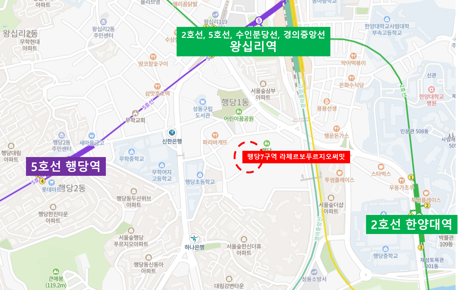근처에 3개의 지하철역이 있다. 행당역(5호선), 왕십리역(2호선, 5호선, 수인분당선, 경의중앙선), 한양대역(2호선)이 근처에 위치해 있어 접근성이 매우 좋다. 행당7구역 라체르보푸르지오써밋은 성동구내에서 입지가 좋은 곳에 위치해있어 성동구의 랜드마크로 충분히 자리잡을 수 있다.