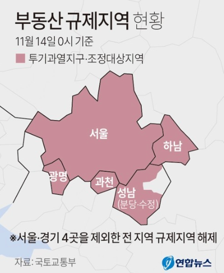 투기과열 39곳, 조정대상지역 60곳 등 규제지역 운영 중이었지만 11.14일 기준으로 서울 및 연접 일부 제외한 수도권 지역 중심으로 해제 서울,광명,과천,성남(분당,수정), 하남 을 제외하고 전부 해제된다.