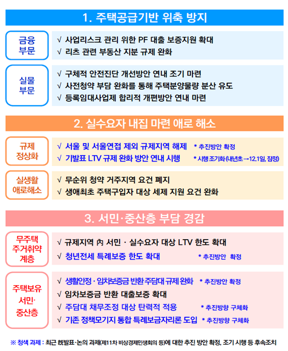 제 11차 비상 경제 미생회의(10.27)때 발표했던 내용의 후속조치다. 무주택 LTV 규제를 50%로 일원화 하고, 투기과열지구 15억 초과 아파트에 대한 주택담보대출 금지 규제도 해제된다. 내년 초 시행한다고 했지만 이번 발표로 12.1일 조기 시행한다.
